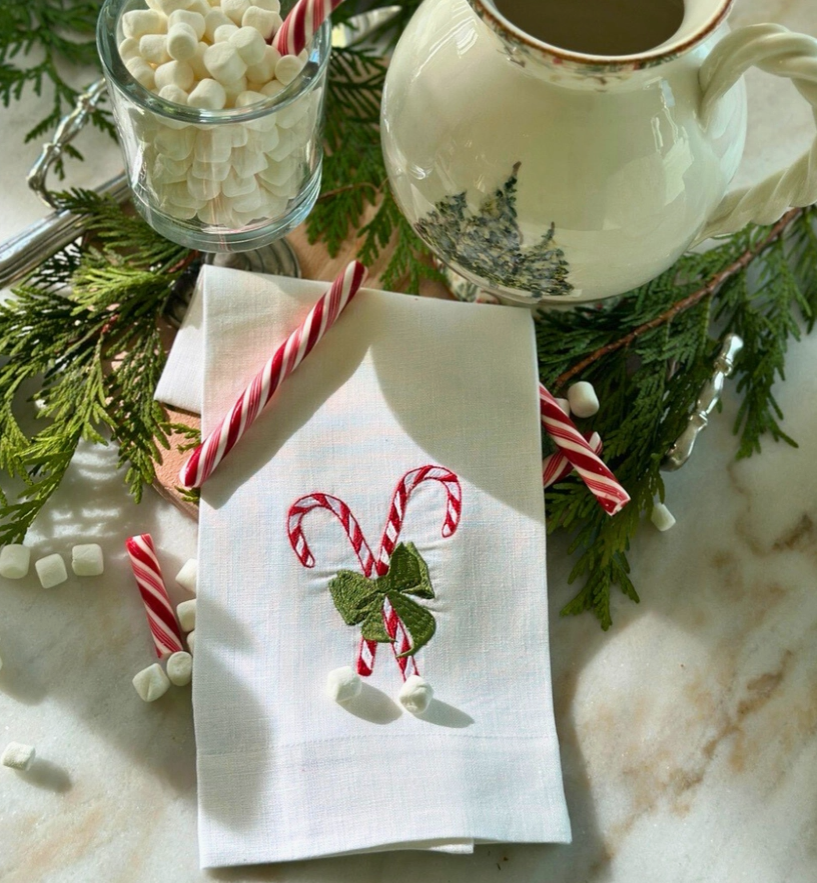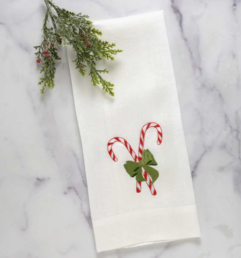 Dress up the kitchen or bath with this beautiful 100% European linen embroidered towel. So many ways to add beauty to any part of your home. Bring festive cheer to your kitchen with the Candy Cane Lane tea towel featuring a classic candy cane design that adds a touch of holiday spirit. Machine wash and iron flat for a crisp look. Tab on back for hanging.