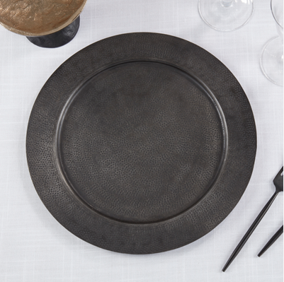 Elevate your table setting with these striking hammered chargers in sophisticated graphite. The textured surface catches light beautifully, adding visual depth and dimension to any dining experience. Perfect for formal dinners, special occasions, or everyday elegance, these chargers provide a refined foundation for your place settings. The neutral graphite tone complements any color palette, making them a versatile addition to your tableware collection. Create an impression of understated luxury that your guests will notice and appreciate.