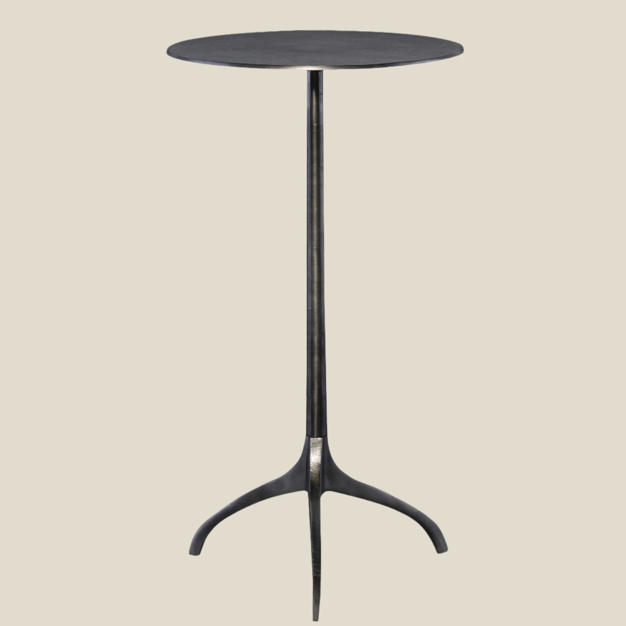 Showcasing industrial styling, this handcrafted accent table features an solid cast aluminum construction with a tripod base finished in antique nickel.14w x 25h x 14d
