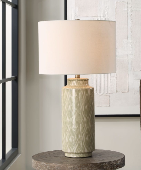 Illuminate your space with the Lauren Table Lamp, featuring a ceramic base with organic pattern in soothing cream and sage glaze, paired with plated brass accents. This elegant lamp brings a touch of serene sophistication to any room. A round hardback shade in off-white linen completes the piece.