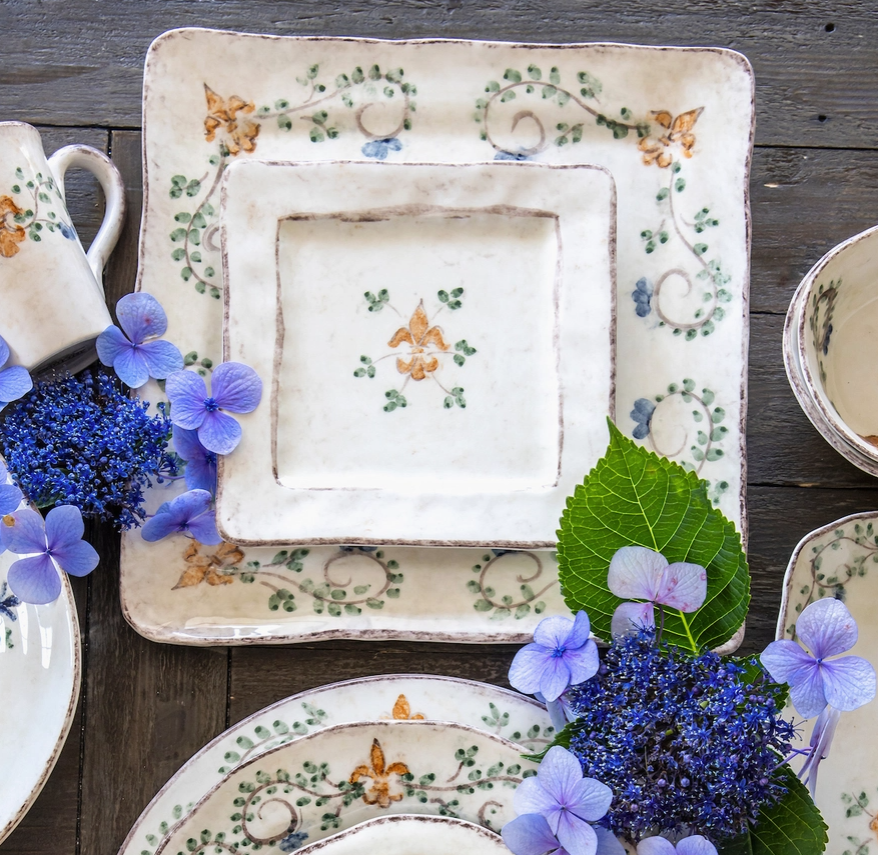 Birth of the Renaissance Before the Renaissance (Rinascimento in Italian), there were the Medicis, the dynastic Italian banking family that financed so many of the period’s transformational achievements. It is a fitting name for this popular collection that has been part of Arte Italica for decades. Its shapes and subtle colors create an old world feel. Unmistakably handmade and hand painted in soft cream shades accented with an interpretation of the Medici's beautiful, signature, giglio (fleur-de-lis) and vine motifs in rich hues of green, blue and orange. Italian ceramic, Hand made in the Umbria Region of Italy.