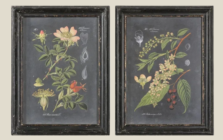 Elevate your space with this striking botanical artwork that bridges classic scientific illustration and contemporary design. Featuring vibrant peach, sage green, and red botanical prints against a richly aged black background, each piece captures timeless elegance. The distressed wooden frame in black finish is accented with gray and taupe tones, while the inner lip showcases a golden-bronze leaf base with intricate black, brown, and taupe distressing for authentic vintage character. Protected under glass, this Vision Studio creation brings sophisticated botanical charm to any room. Perfect for collectors and design enthusiasts seeking statement art with depth and personality. 25"W × 33"H × 2"D.
